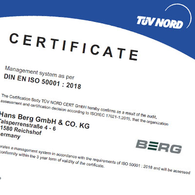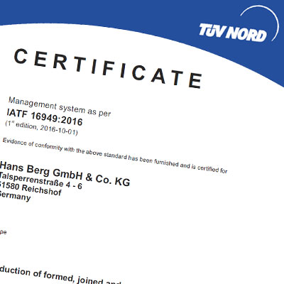 At Berg, quality and environmental management are fully integrated in all processes and procedures – and firmly embedded as core components of the company policy. Both internally and externally, our efforts are documented by the demanding and strict certification requirements of DIN EN ISO 9001:2008 and DIN EN ISO 14001:2004. They signal the company's ambitious aspirations regarding responsible treatment of people and environment. In addition, Berg's management system also meets the technical specifications of the international automotive industry according to ISO/TS 16949:2009.